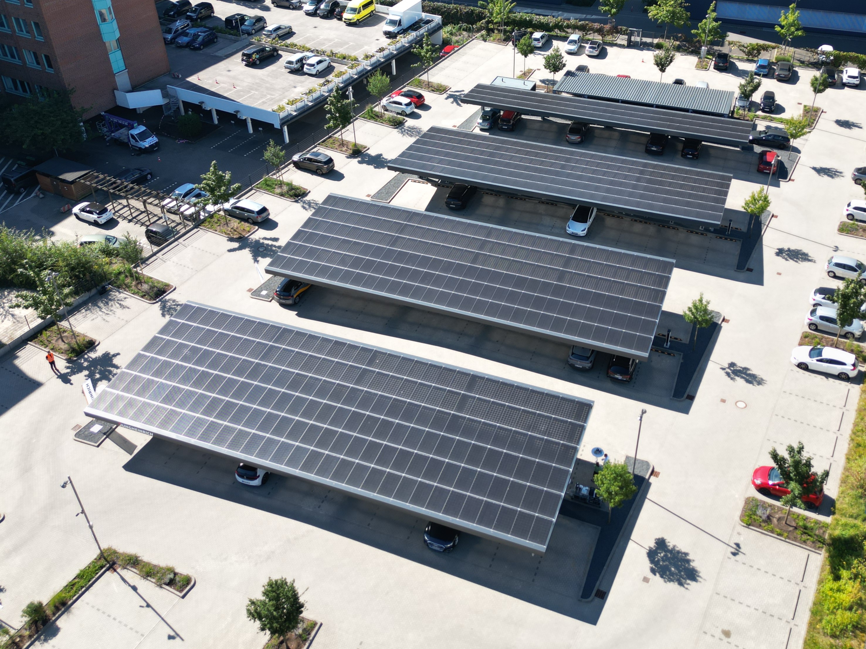 Savā uzņēmuma galvenajā mītnē Hamburgas Vandsbekas rajonā Jungheinrich ar fotoelementu sistēmu ir nodrošinājis darbinieku autostāvvietu. Šodien 1100 kvadrātmetru lielo objektu atklāja Hamburgas ekonomikas un inovāciju senatore Melānija Leonharda (Melanie Leonhard), Jungheinrich izpilddirektors Larss Bržoska (Lars Brzoska) un Hamburgas rūpniecības asociācijas priekšsēdētājs Matiass Boksbergers (Matthias Boxberger). Saules enerģijas autostāvvieta ar 630 fotoelementu moduļiem un maksimālo jaudu aptuveni 200 kW ir lielākā šāda veida autostāvvieta Hamburgā. Turpmāk Jungheinrich darbinieki darba laikā varēs uzlādēt savus privātos elektriskos transportlīdzekļus 48 no kopumā 52 elektriskās uzlādes punktiem zem saules bateriju nojumēm. Vēl četri uzlādes punkti ir brīvi pieejami un tādējādi veido daļu no Hamburgas publiskās uzlādes infrastruktūras elektromobilitātei. Saules enerģijas autostāvvietas fotoelementu jumta gada jauda ir pietiekama, lai pilnībā uzlādētu vidēji aptuveni 4000 elektromobiļu akumulatoru gadā. Jungheinrich jaunajā iekārtā kopumā investē 1,7 miljonus eiro. Lai to paveiktu, Grupa nav izmantojusi nekādu valsts finansējumu.